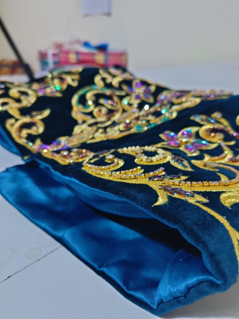 Création de tenues traditionnelles pour la mariée avec couture fine et finitions haut de gamme.